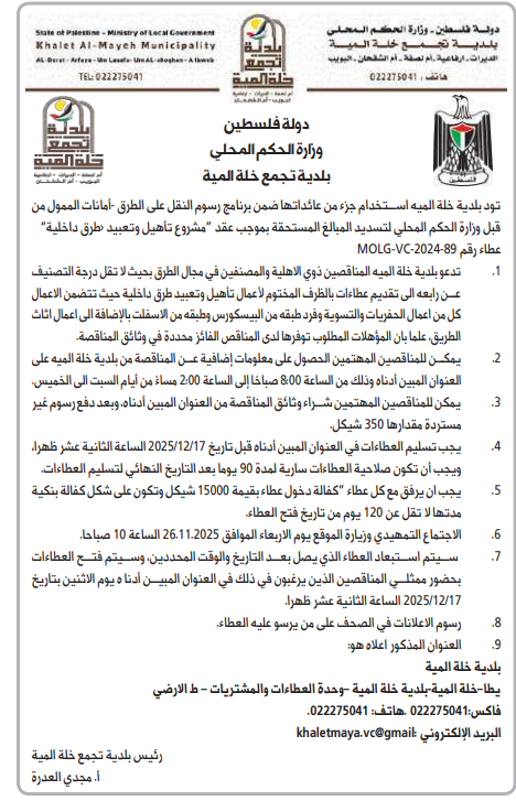 الفلسطينية (MA)، عن إعادة طرح عطاء شق وتأهيل طرق زراعية في بلدة سنجل / محافظه رام الله يمكن للمقاولين المسجلين والمصنفين بشهادة تسجيل وتصنيف سارية المفعول لدى لجنة التصنيف الوطنية | والراغبين بالاشتراك في هذا العطاء استلام نسخة عن وثائق العطاء مقابل مبلغ 200 شيكل غير مستردة عن كل نسخة عطاء ابتداءً من يوم الاثنين 2025/11/17 ولغاية يوم الاثنين 2025/11/24 ما بين الساعة التاسعة صباحا والثانية والنصف بعد الظهر في مكاتب مجموعة الهيدرولوجيين الفلسطينيين في رام الله شارع اميل حبيبي - الماصيون فوق سوبر مارك برافو - الطابق الثاني، ونابلس - شارع جامعة النجاح - عمارة بلازا الطابق الأول. تعاد العطاءات الى مقر مجموعة الهيدرولوجيين الفلسطينيين في رام الله حتى موعد أقصاه الساعة العاشرة - والنصف صباح يوم الثلاثاء 2025/11/25، تفتح العطاءات يوم الثلاثاء 2025/11/25 الساعة الحادية عشرة في مقر مؤسسة التعاون في رام الله.