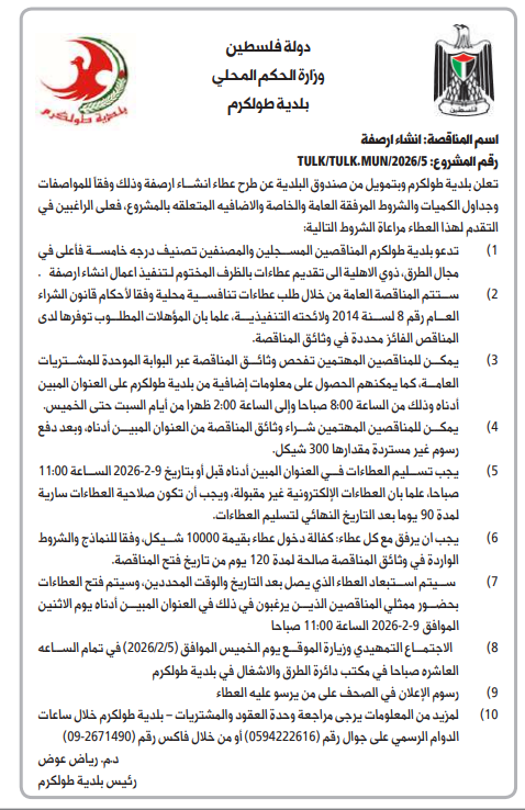 تعلن بلدية طولكرم وبتمويل من صندوق البلدية عن طرح عطاء انشاء ارصفة وذلك وفقا للمواصفات وجداول الكميات والشروط المرفقة العامة والخاصة والاضافيه المتعلقه بالمشروع، فعلى الراغبين في التقدم لهذا العطاء مراعاة الشروط التالية: