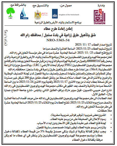 تعلن مجموعة الهيدرولوجيين الفلسطينيين من خلال برنامج الاستثمار بالمياه، الأرض والطرق الزراعية، والذي يحمل رقم 4000005167 والممول من الممثلية الهولندية والذي يدار من قبل مؤسسة التعاون وينفذ بالشراكة مع مجموعة الهيدرولوجيين الفلسطينيين (PHG) ومركز أبحاث الأراضي (LRC) ، وبالتنسيق مع وزارة الزراعة