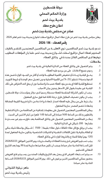 تدعو بلدية بيت لحم المناقصين ذوي الاهلية من المناقصين المعتمدين للتقدم بالظرف المختوم لعطاء اعمال تراقيع اسفلت لشوارع مدينة بيت لحم، علما بان المؤهلات المطلوب توفرها لدى المناقص الفائز محددة في وثائق العطاء. ملاحظات: