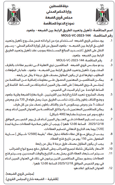 تعلن بلدية حبلة / قلقيلية وبتمويل ذاتي من موازنة البلدية مشروع رقم 003-2025-HM-R عن طرح عطاء تأهيل وتعبيد طرق داخلية في حبلة وفقا للمخططات وجداول الكميات والشروط المرفقة العامة والخاصة بالمشروع ، فعلى المقاولين الراغبين التقدم لهذا العطاء مراعاة - الشروط التالية :