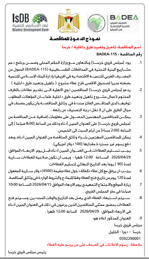 - زيارة الموقع والاجتماع التمهيدي يوم الثلاثاء الموافق 2026/3/31 الساعة 1:00 ظهرا في مقر المجلس القروي.