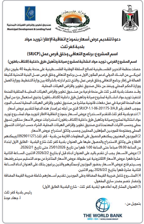 وقد حصلت بلدية كفر ثلث على منحة فرعية من صندوق تطوير وإقراض الهيئات المحلية المتلقية للمنحة لتنفيذ توريد مواد انشائية لمشروع صيانة وتأهيل طرق داخلية اكتاف باطون)، وتنوي استعمال جزء من أموال هذه المنحة الفرعية في عمل دفعات قانونية مباشرة من صندوق تطوير وإقراض الهيئات المحلية لحساب المورد بموجب العقد رقم 3/46-201175-06-11-SRJCP الذي من أجله تم إصدار هذه الدعوة لتقديم عروض أسعار.