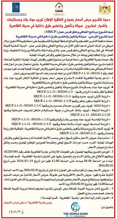 حصلت منظمة التحرير الفلسطينية لصالح السلطة الوطنية الفلسطينية على منحة بقيمة 40 مليون دولار امريكي من البنك الدولي لدعم المكون الأول من برنامج التعافي وخلق فرص عمل - البنية التحتية كثيفة العمالة في إطار برنامج التعافي وخلق فرص عمل، والذي يتم ادارته بالشراكة بين وزارة التخطيط وزارة العمل وزارة الحكم المحلي وينفذ من خلال صندوق تطوير وإقراض الهيئات المحلية. وقد حصلت بلدية الظاهرية على منحة فرعية من صندوق تطوير وإقراض الهيئات المحلية (المتلقية للمنحة) لتنفيذ مشروع صيانة وتأهيل وتخضير طرق داخلية في مدينة الظاهرية، وتنوي استعمال جزء من أموال هذه المنحة الفرعية في عمل دفعات قانونية مباشرة من صندوق تطوير وإقراض الهيئات المحلية لحساب المورد الذي من أجله تم إصدار هذه الدعوة لتقديم عروض أسعار.