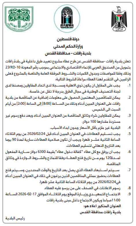 تعلن بلدية رافات - محافظة القدس عن طرح عطاء مشروع تعبيد طرق داخلية في بلدة رافات بتمويل من الصندوق العربي للإنماء الاقتصادي والاجتماعي بموجب رقم المعونة 10-RD/23 وذلك وفقا للمواصفات وجدول الكميات والشروط المرفقة العامة والخاصة بالمشروع فعلى الراغبين في التقدم لهذا العطاء مراعاة الشروط التالية: