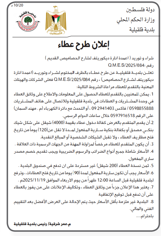 تعلن بلدية قلقيلية عن طرح عطاء بالظرف المختوم لشراء وتوريد (اعمدة انارة ديكوريتف لشارع الحصاميص) ، رقم 2025/084/Q.M.E.S فعلى الشركات والهيئات المعنية بالتقدم للعطاء مراعاة الشروط التالية:
