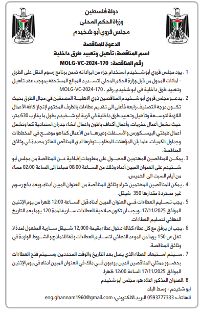 اسم المناقصة : مشروع تأهيل وتعبيد طرق داخلية في جوريش - محافظة نابلس رقم المناقصة: 130-2024- MOLG - V