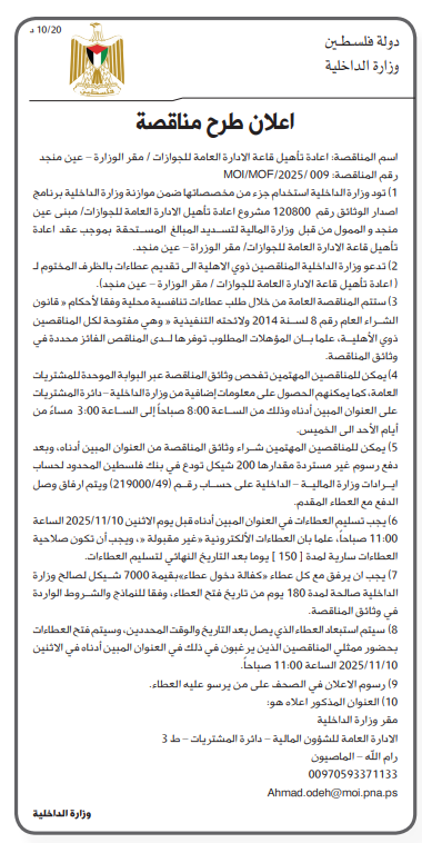 اسم المناقصة اعادة تأهيل قاعة الادارة العامة للجوازات / مقر الوزارة – عين منجد