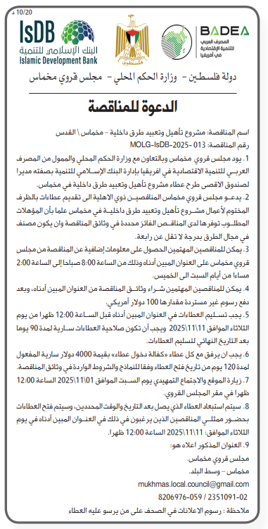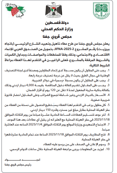 يعلن مجلس قروي جفنا عن طرح عطاء تأهيل وتعبيد الشارع الرئيسي (باتجاه بيرزيت) رقم المشروع 22-22-JIFNA، بتمويل من الصندوق العربي للإنماء الاقتصادي والاجتماعي، وذلك وفقاً للمخططات والمواصفات وجداول الكميات والشروط المرفقة بالمشروع، فعلى الراغبين في التقدم لهذا العطاء مراعاة الشروط التالية: