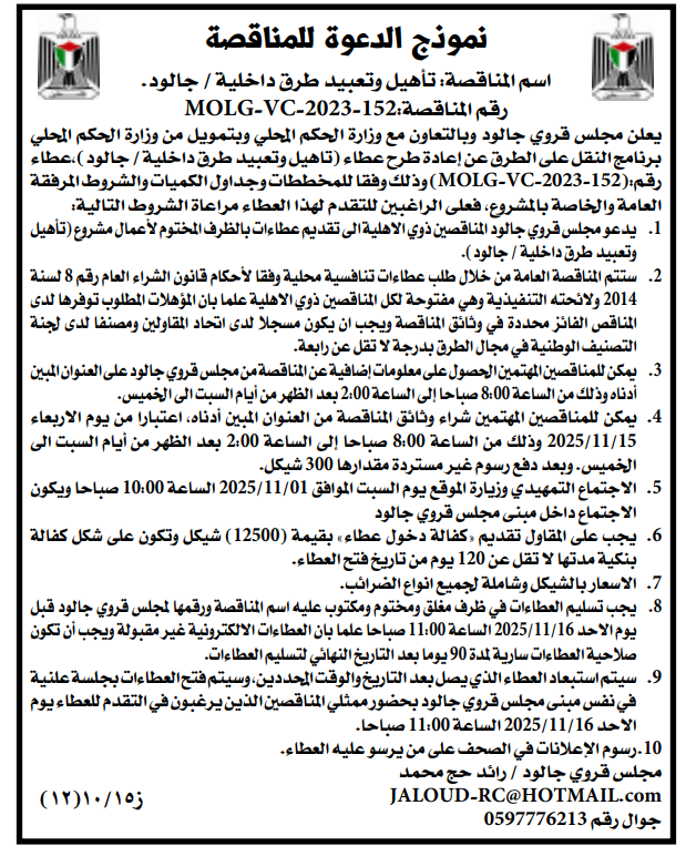 يعلن مجلس قروي جالود وبالتعاون مع وزارة الحكم المحلي وبتمويل من وزارة الحكم المحلي برنامج النقل على الطرق عن إعادة طرح عطاء تاهيل وتعبيد طرق داخلية / جالود) عطاء رقم: (152-2023-MOLG-VC) وذلك وفقا للمخططات وجداول الكميات والشروط المرفقة العامة والخاصة بالمشروع، فعلى الراغبين للتقدم لهذا العطاء مراعاة الشروط التالية: