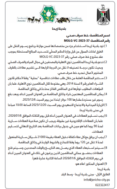 (4) يمكن للمناقصين المهتمين شراء وثائق المناقصة من العنوان المبين ادناه، وبعد دفع رسوم غير مستردة مقدارها 100 دولار ابتداء من يوم السبت 2025/12/6. (5) الزيارة الميدانية والاجتماع التمهيدي يوم السبت 2025/12/20 الساعة 10:00 صباحا في مبنى بلدية اريحا