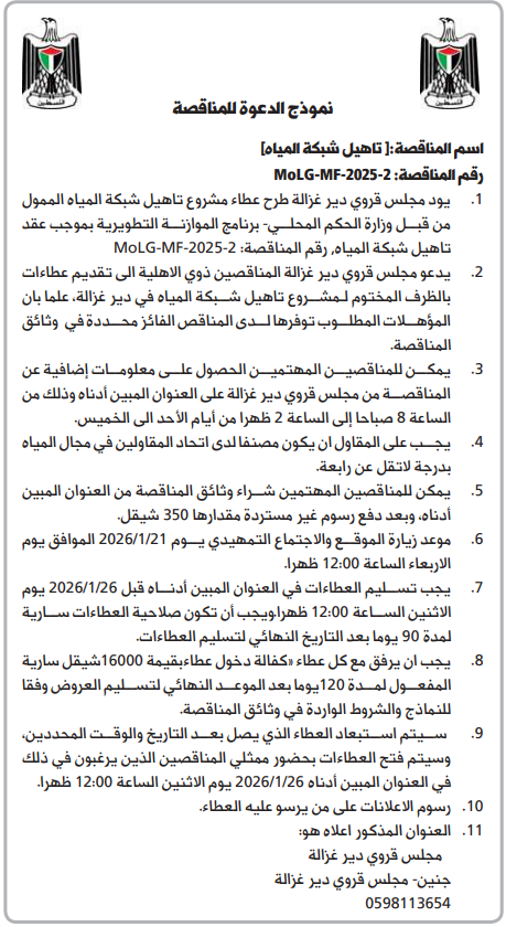يدعو مجلس قروي دير غزالة المناقصين ذوي الاهلية الى تقديم عطاءات بالظرف المختوم لمشروع تأهيل شبكة المياه في دير غزالة، علما بان المؤهلات المطلوب توفرها لدى المناقص الفائز محددة في وثائق المناقصة.