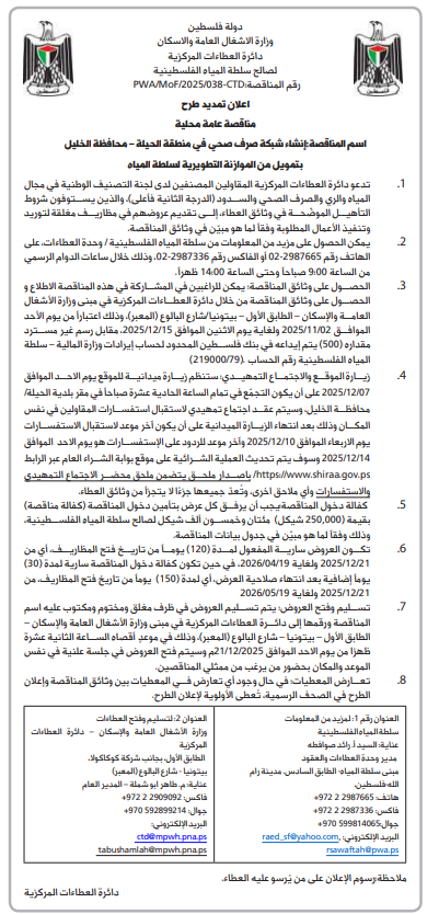- الحصول على وثائق المناقصة: يمكن للراغبين في المشاركة في هذه المناقصة الاطلاع و الحصول على وثائق المناقصة من خلال دائرة العطاءات المركزية في مبنى وزارة الأشغال العامة والإسكان - الطابق الأول - بيتونيا / شارع البالوع (المعبر)، وذلك اعتباراً من يوم الأحد الموافق 2025/11/02 ولغاية يوم الاثنين الموافق 2025/12/15، مقابل رسم غیر مسترد مقداره (500) يتم إيداعه في بنك فلسطين المحدود لحساب إيرادات وزارة المالية - سلطة المياه الفلسطينية رقم الحساب (219000/79)