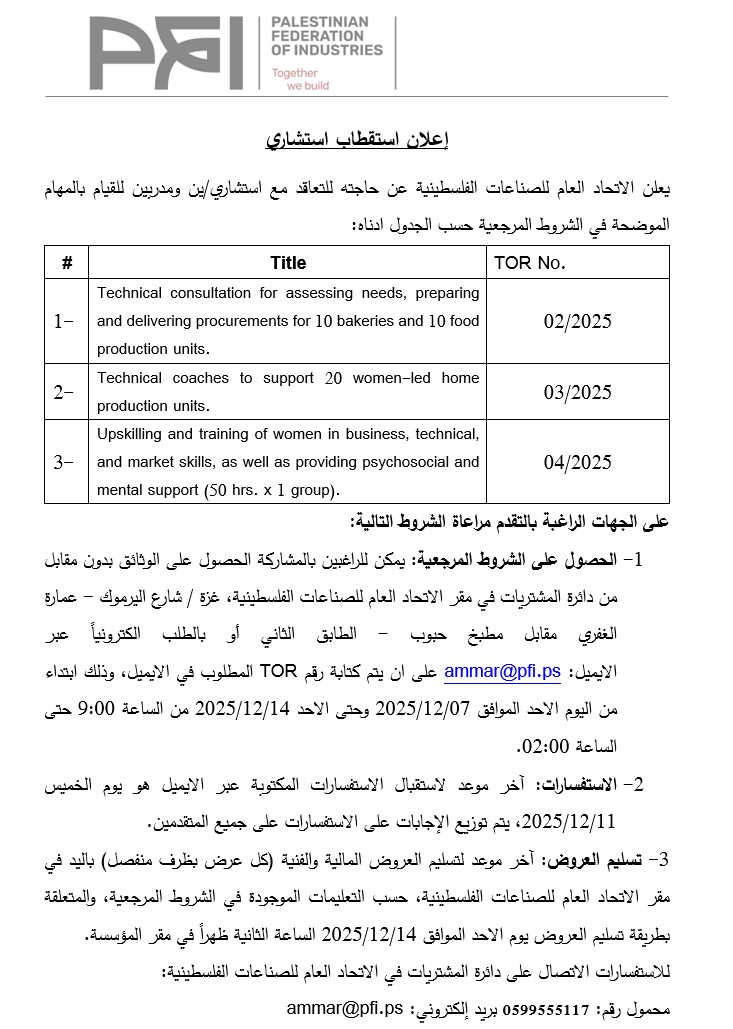 3- تسليم العروض : آخر موعد لتسليم العروض المالية والفنية (كل) عرض بظرف منفصل) باليد في مقر الاتحاد العام للصناعات الفلسطينية، حسب التعليمات الموجودة في الشروط المرجعية، والمتعلقة بطريقة تسليم العروض يوم الاحد الموافق 2025/12/14 الساعة الثانية ظهراً في مقر المؤسسة.