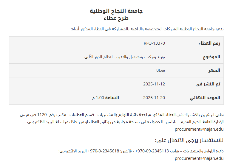 تدعو جامعة النجاح الوطنية الشركات المتخصصة والراغبة بالمشاركة في العطاء المذكور أدناه: