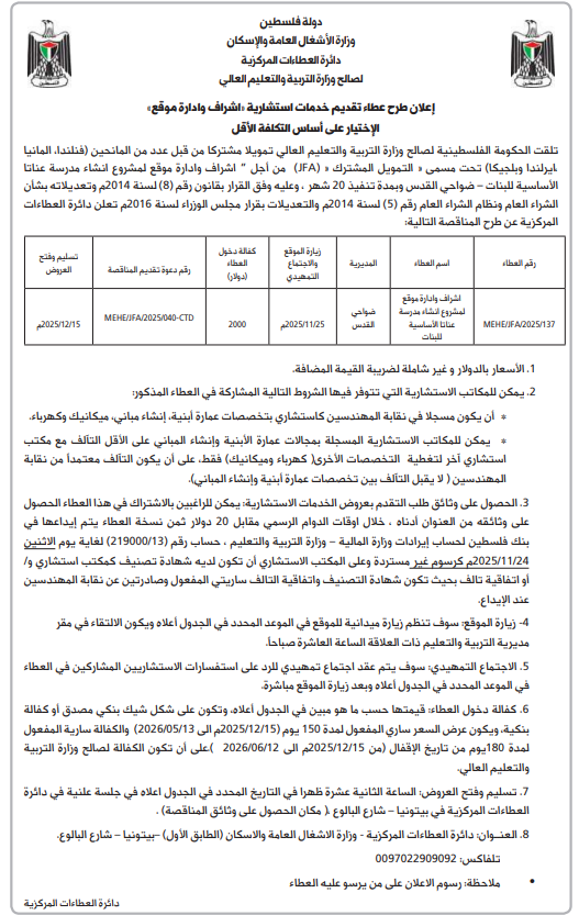تلقت الحكومة الفلسطينية لصالح وزارة التربية والتعليم العالي تمويلا مشتركا من قبل عدد من المانحين (فنلندا، المانيا ايرلندا وبلجيكا) تحت مسمى : التمويل المشترك : (JFA) من أجل " اشراف وادارة موقع لمشروع انشاء مدرسة عناتا الأساسية للبنات - ضواحي القدس وبمدة تنفيذ 20 شهر ، وعليه وفق القرار بقانون رقم (8) لسنة 2014م وتعديلاته بشأن الشراء العام ونظام الشراء العام رقم (5) لسنة 2014م والتعديلات بقرار مجلس الوزراء لسنة 2016م تعلن دائرة العطاءات المركزية عن طرح المناقصة التالية: