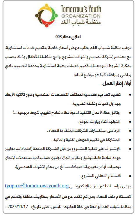 ترغب منظمة شباب الغد بطلب عروض أسعار خاصة بتقديم خدمات استشارية مع مهندس شركة تصميم واشراف المشروع برامج متكاملة للأطفال وذلك بحسب - مذكرة الشروط المرجعية لتقديم خدمات مهمة استشارية محددة لتصميم نادي رياضي ومرافقه كما هو موضح أدناه:
