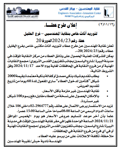 تعلن نقابة المهندسين عن طرح عطاء لتوريد أثاث مكتبي خاص بفرع الخليل عطاء رقم (202024/23