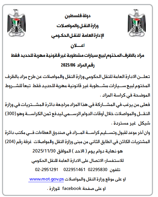للاستفسار الاتصال على الادارة العامة للنقل الحكومي تلفون 02295830 022951461 2951291-02 او على موقع وزارة النقل والمواصلات www.mot.gov.ps او على صفحة facebook للوزارة .