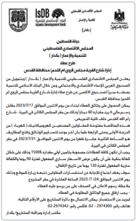 يعلن المجلس الاقتصادي الفلسطيني للتنمية والإعمار ( بكدار ) وبتمويل من الصندوق العربي للإنماء الاقتصادي والاجتماعي ومن خلال البنك الاسلامي للتنمية بصفته مديراً لصندوق الأقصى عن طرح عطاء إنارة شارع القرية مجلس قروي ام اللحم/ محافظة القدس.