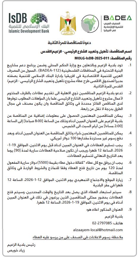 ملاحظة: رسوم الاعلانات في الصحف على من يرسو عليه العطاء