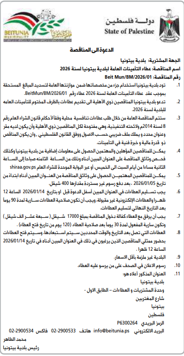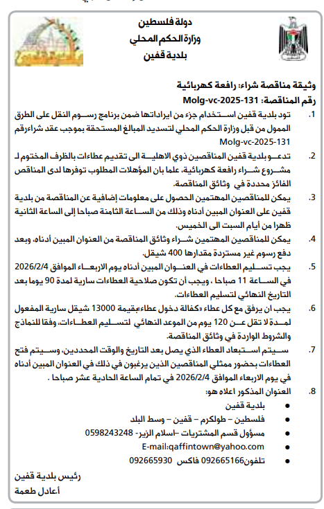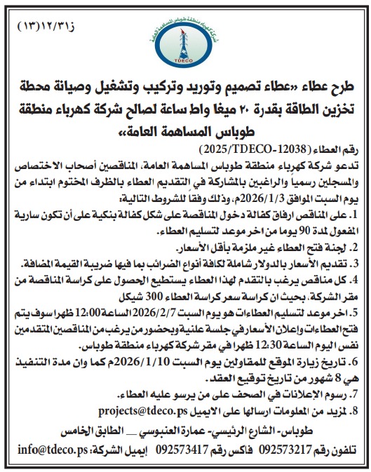 تدعو شركة كهرباء منطقة طوباس المساهمة العامة، المناقصين أصحاب الاختصاص والمسجلين رسميا والراغبين بالمشاركة في التقديم العطاء بالظرف المختوم ابتداء من يوم السبت الموافق 2026/1/3م، وذلك وفقا للشروط التالية: