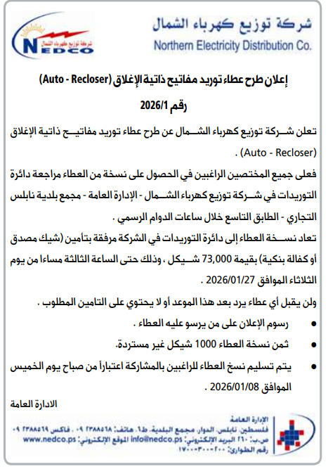 تعلن شركة توزيع كهرباء الشمال عن طرح عطاء توريد مفاتيح ذاتية الإغلاق (Auto - Recloser).