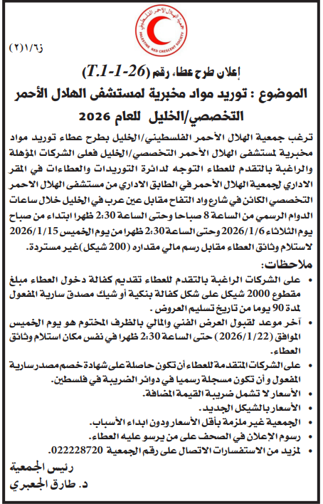 ترغب جمعية الهلال الأحمر الفلسطيني / الخليل بطرح عطاء توريد مواد مخبرية لمستشفى الهلال الأحمر التخصصي / الخليل فعلى الشركات المؤهلة والراغبة بالتقدم للعطاء التوجه لدائرة التوريدات والعطاءات في المقر الاداري لجمعية الهلال الأحمر في الطابق الاداري من مستشفى الهلال الاحمر التخصصي الكائن في شارع واد التفاح مقابل عين عرب في الخليل خلال ساعات الدوام الرسمي من الساعة 8 صباحا وحتى الساعة 12:30 ظهرا ابتداء من صباح يوم الثلاثاء 2026/1/6 وحتى الساعة 12:30 ظهرا من يوم الخميس 2026/1/15 لاستلام وثائق العطاء