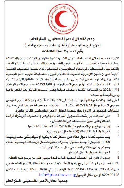 تتوجه جمعية الهلال الأحمر الفلسطيني للشركات والمقاوليين المتخصصين بالمشاركة بعطاء تجهيز وتأهيل ساحة ومستودع الطيرة - رام الله ، فعلى شركات المقاولات والمقاوليين المسجلين في اتحاد المقاولين والمصنفين لدى لجنة التصنيف الوطنية ابنية) على ان تكون اقل درجة تصنيف ثالثة والراغبين بالمشاركة التوجه لمقر الجمعية الكائن في شارع القدس الرئيسي - البيرة دائرة المشتريات ، الطابق الرابع لشراء كراسة العطاء وذلك اعتباراً من يوم الاحد الموافق 2025/11/09 حتى يوم الاحد الموافق 2025/11/16 من الساعة الثامنة والنصف صباحاً وحتى الساعة الثالثة بعد الظهر، ما عدا يومي الجمعة والسبت.