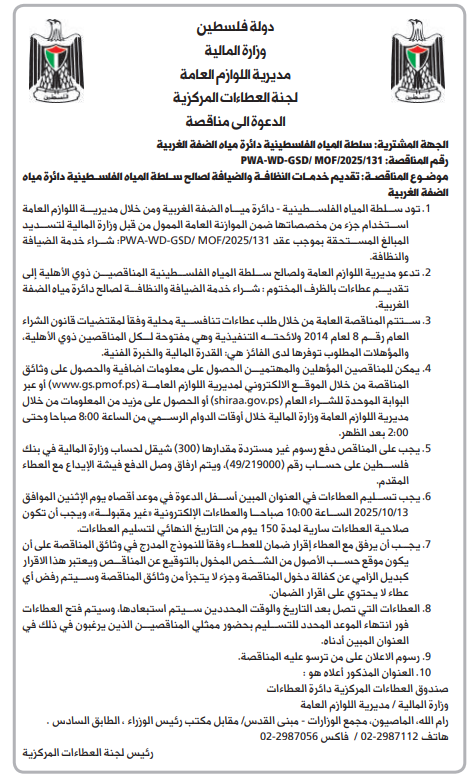 2. تدعو مديرية اللوازم العامة ولصالح سلطة المياه الفلسطينية المناقصين ذوي الأهلية إلى تقديم عطاءات بالظرف المختوم : شراء خدمة الضيافة والنظافة لصالح دائرة مياه الضفة الغربية.