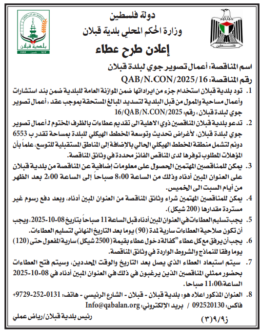 3. ستتم المناقصة العامة من خلال طلب عطاءات تنافسية محلية وفقا لمقتضيات قانون الشراء العام رقم 8 لعام 2014 ولائحته التنفيذية وهي مفتوحة لكل المناقصين ذوي الأهلية والمؤهلات المطلوب توفرها لدى الفائز هي: القدرة المالية والخبرة الفنية.