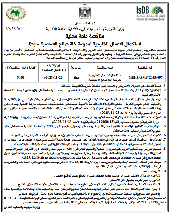 تلقت وزارة التربية والتعليم العالي تمويلا من صندوق النقد العربي بإدارة البنك الاسلامي للتنمية بصفته مديراً لصندوق الاقصى من أجل انشاء وصيانة مدارس في الضفة الغربية ، وعليه وفق القرار بقانون رقم (8) لسنة 2014م وتعديلاته بشأن الشراء العام ونظام الشراء العام رقم (5) لسنة 2014م وتعديلاتهما، تعلن وزارة التربية والتعليم العالي عن طرح المناقصة التالية: