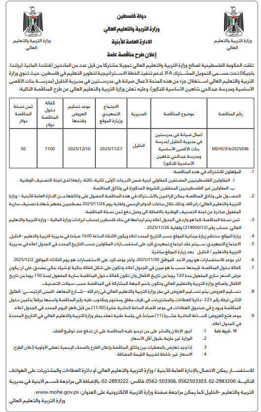 تلقت الحكومة الفلسطينية لصالح وزارة التربية والتعليم العالي تمويلا مشتركا من قبل عدد من المانحين (فنلندا، المانيا، ايرلندا، بلجيكا) تحت مسمى التمويل المشترك JFA لدعم تنفيذ الخطة الاستراتيجية لتطوير التعليم في فلسطين، حيث تنوي وزارة التربية والتعليم العالي استغلال جزء من هذه المنحة الأعمال صيانة في مدرستين في مديرية الخليل (مدرسة بنات الأقصى الأساسية ومدرسة عبدالحي شاهين الأساسية للذكور)، وعليه تعلن وزارة التربية والتعليم العالي عن طرح المناقصة التالية: