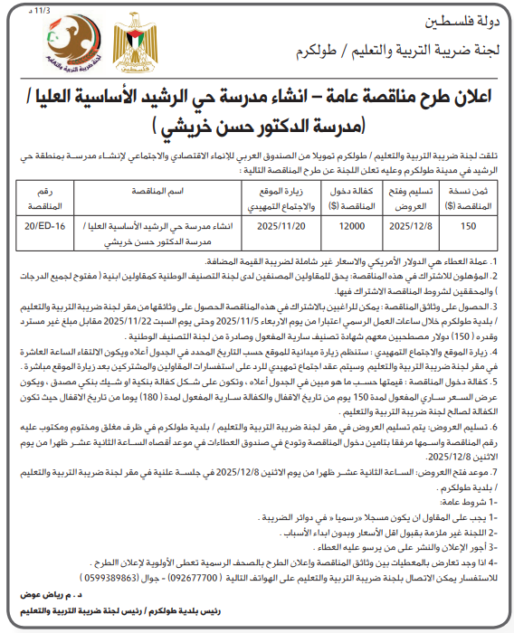 تلقت لجنة ضريبة التربية والتعليم / طولكرم تمويلا من الصندوق العربي للإنماء الاقتصادي والاجتماعي لإنشاء مدرسة بمنطقة حي الرشيد في مدينة طولكرم وعليه تعلن اللجنة عن طرح المناقصة التالية :