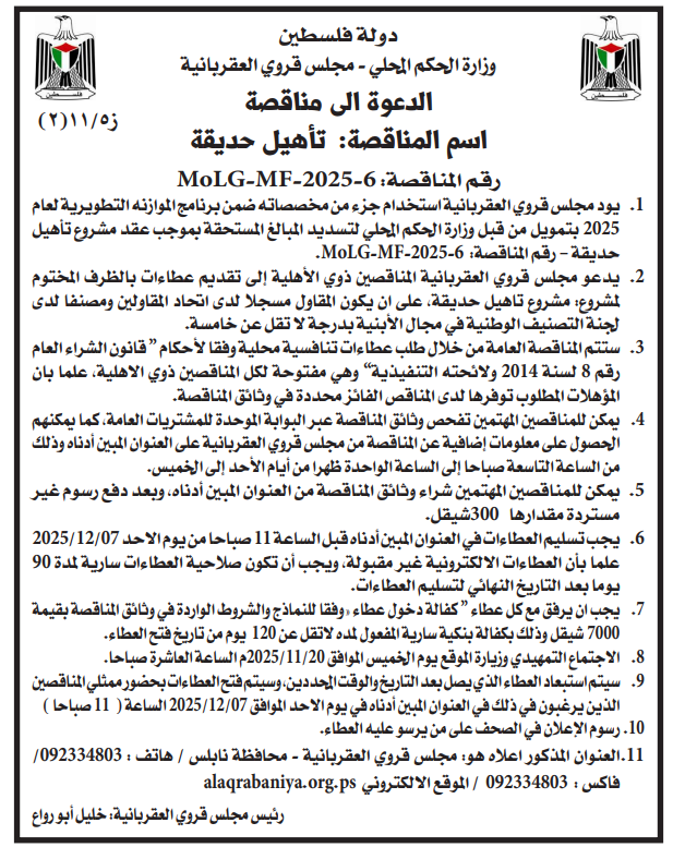 (10) فتح العطاء يوم الاحد الموافق 2025/11/23 الساعة 10:00 صباحا في مقر بلدية جنين.