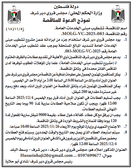 اسم المناقصة تشطيب مبنى الخدمات العامة. رقم المناقصة : 083-2025-MOLG-VC.