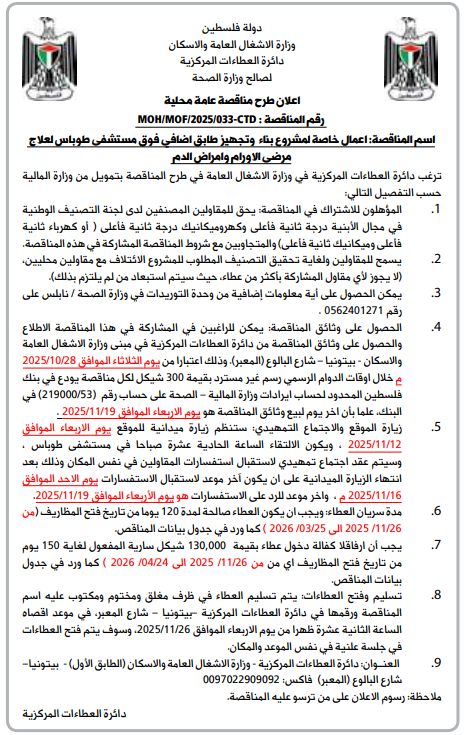 اسم المناقصة: اعمال خاصة لمشروع بناء وتجهيز طابق اضافي فوق مستشفى طوباس لعلاج مرضى الأورام وامراض الدم