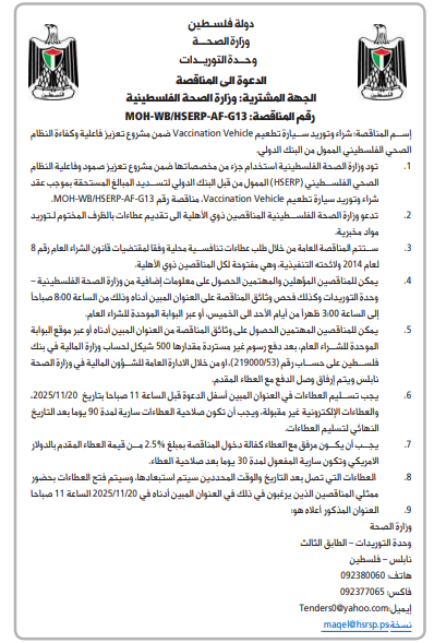 سم المناقصة شراء وتوريد سيارة تطعيم Vaccination Vehicle ضمن مشروع تعزيز فاعلية وكفاءة النظام الصحي الفلسطيني الممول من البنك الدولي.