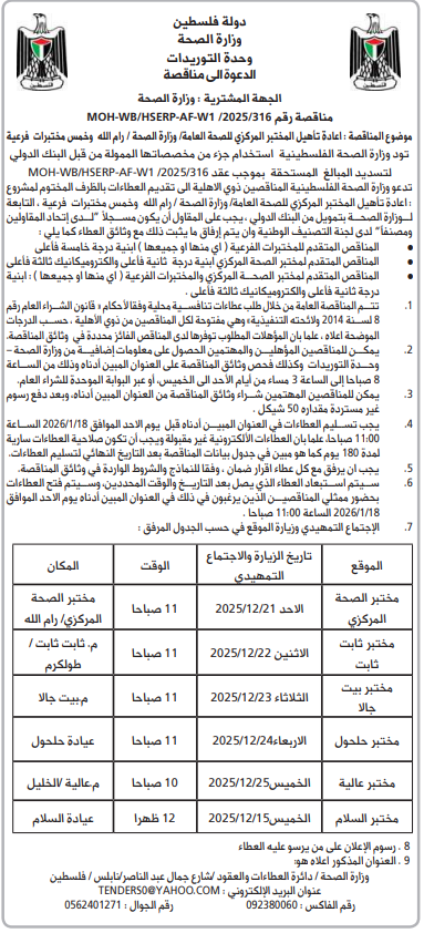 تدعو وزارة الصحة الفلسطينية المناقصين ذوي الاهلية الى تقديم العطاءات بالظرف المختوم لمشروع : اعادة تأهيل المختبر المركزي للصحة العامة وزارة الصحة / رام الله وخمس مختبرات فرعية ، التابعة لوزارة الصحة بتمويل من البنك الدولي ، يجب على المقاول أن يكون مسجلاً "لدى إتحاد المقاولين ومصنفاً" لدى لجنة التصنيف الوطنية وان يتم إرفاق ما يثبت ذلك مع وثائق العطاء كما يلي :