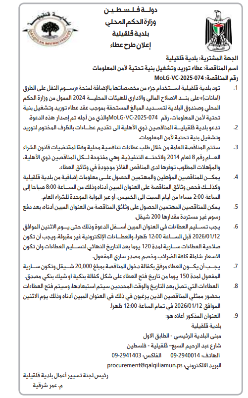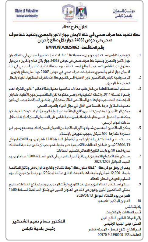 بلدية نابلس قسم العطاءات والمشتريات رقم الغرفة الطابق الطابق الاول :المبنى مبنى البلدية الرئيسي اسم الشارع شارع فيصل - المدينة نابلس الهاتف: 135-2390000-9-00970