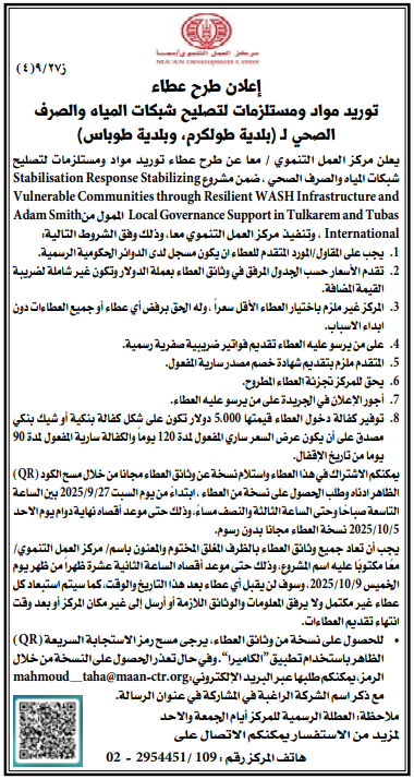يعلن مركز العمل التنموي / معا عن طرح عطاء توريد مواد ومستلزمات لتصليح شبكات المياه والصرف الصحي ، ضمن مشروع Stabilisation Response Stabilizing Vulnerable Communities through Resilient WASH Infrastructure and Adam Smith Jet Local Governance Support in Tulkarem and Tubas International ، وتنفيذ مركز العمل التنموي معا، وذلك وفق الشروط التالية: