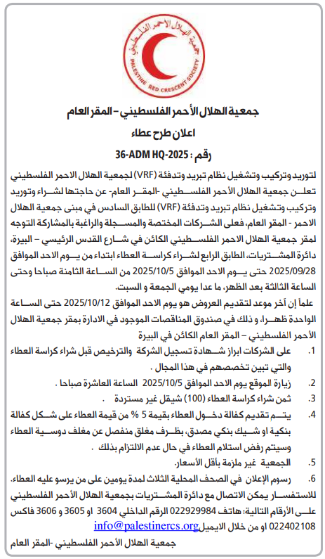 تعلن جمعية الهلال الأحمر الفلسطيني - المقر العام عن حاجتها لشراء وتوريد وتركيب وتشغيل نظام تبريد وتدفئة (VRF) للطابق السادس في مبنى جمعية الهلال الاحمر - المقر العام، فعلى الشركات المختصة والمسجلة والراغبة بالمشاركة التوجه لمقر جمعية الهلال الاحمر الفلسطيني الكائن في شارع القدس الرئيسي – البيرة، دائرة المشتريات، الطابق الرابع لشراء كراسة العطاء ابتداء من يوم الاحد الموافق 2025/09/28 حتى يوم الاحد الموافق 2025/10/5 من الساعة الثامنة صباحا وحتى الساعة الثالثة بعد الظهر، ما عدا يومي الجمعة و السبت.