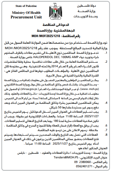وزارة الصحة - وحدة التوريدات / دائرة العطاءات والعقود - فلسطين - نابلس عنوان البريد الإلكتروني : [email protected] رقم الفاكس : 2380060 09رقم الجوال : 0562401271