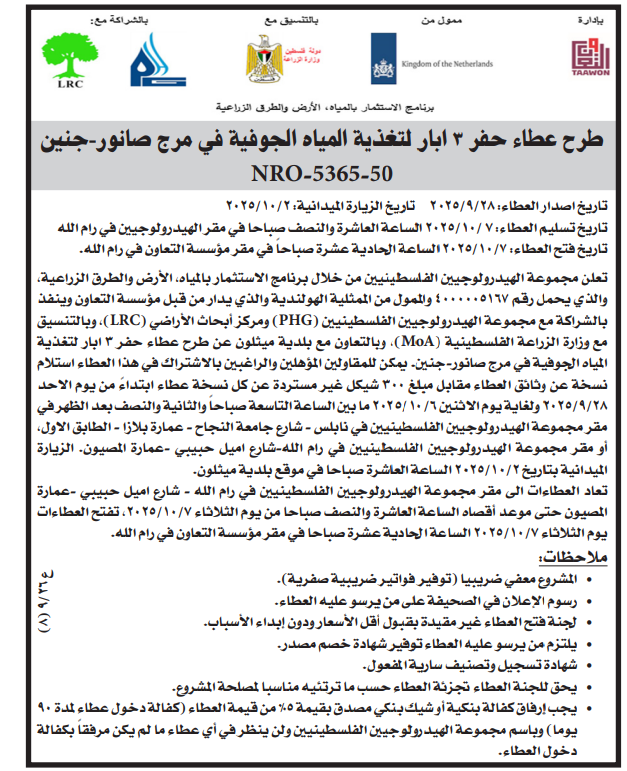 تعلن مجموعة الهيدرولوجيين الفلسطينيين من خلال برنامج الاستثمار بالمياه، الأرض والطرق الزراعية والذي يحمل رقم ٤٠٠٠٠٠٥١٦٧ والممول من الممثلية الهولندية والذي يدار من قبل مؤسسة التعاون وينفذ بالشراكة مع مجموعة الهيدرولوجيين الفلسطينيين (PHG) ومركز أبحاث الأراضي (LRC)، وبالتنسيق مع وزارة الزراعة الفلسطينية (MoA)، وبالتعاون مع بلدية ميثلون عن طرح عطاء حفر ۳ ابار لتغذية المياه الجوفية في مرج صانور - جنين.