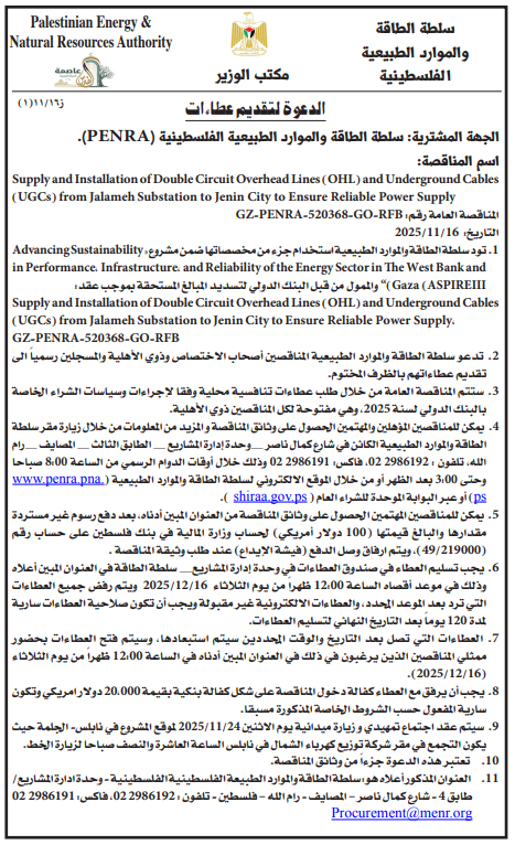 المناقصة العامة رقم : GZ-PENRA-520368-GO-RFB التاريخ: 2025/11/16