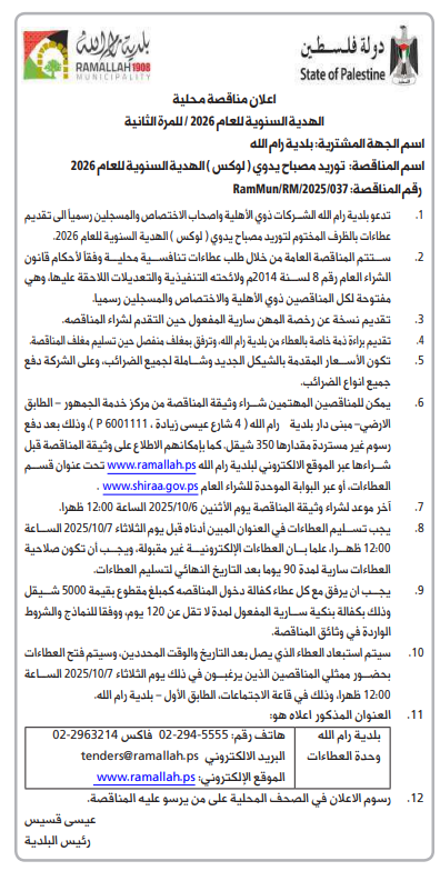 رقم المناقصة : 2025/037/RamMun/RM