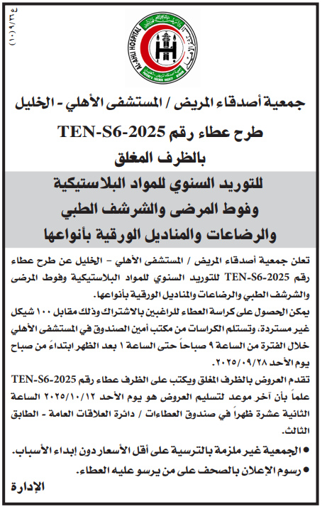 تعلن جمعية أصدقاء المريض / المستشفى الأهلي - الخليل عن طرح عطاء رقم 2025-TEN-S6 للتوريد السنوي للمواد البلاستيكية وفوط المرضى والشرشف الطبي والرضاعات والمناديل الورقية بأنواعها.