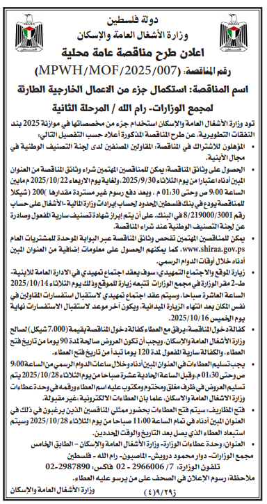 تاريخ فتح العطاء : ٢٠٢٥/١٠/٧ الساعة الحادية عشرة صباحاً في مقر مؤسسة التعاون في رام الله.