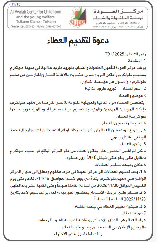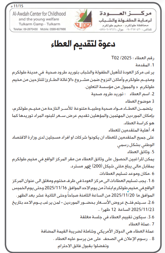 للموردين المؤهلين والمسجلين والمرخصين الحق في الاشتراك، علما بان آخر موعد لتقديم العروض هو يوم الاحد 2025/11/30 حتى الساعة الواحدة ظهرا ، وذلك في صندوق المناقصات الموجود في الدائرة الادارية بمقر جمعية الهلال الأحمر الفلسطيني الكائن في البيرة.