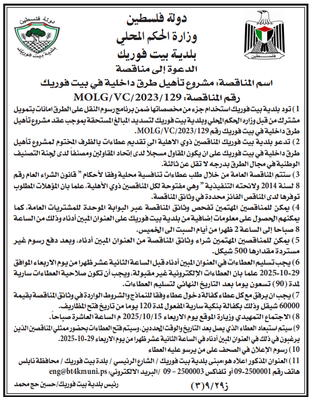 (2) تدعو بلدية بيت فوريك المناقصين ذوي الاهلية الى تقديم عطاءات بالظرف المختوم لمشروع تأهيل طرق داخلية في بيت فوريك على ان يكون المقاول مسجلا لدى إتحاد المقاولين ومصنفا لدى لجنة التصنيف الوطنية في مجال الطرق بدرجه لا تقل عن ثالثة.